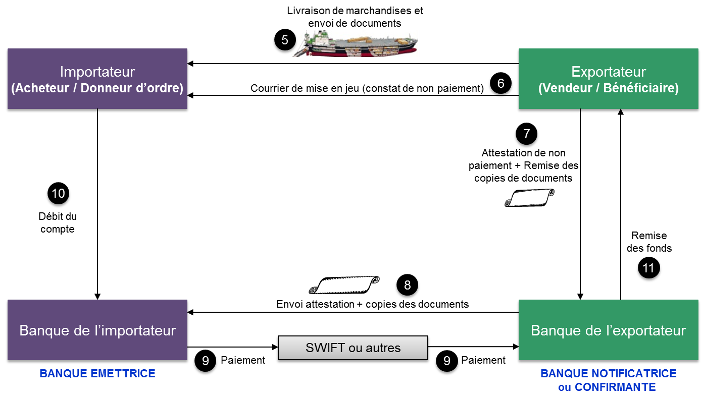 Le délai de paiement expire et l’exportateur n’a toujours pas son argent. Il se met en relation avec l’importateur pour l’informer qu’il n’a toujours pas reçu les fonds attendus et qu’il va faire appel à la garantie. Dans la réalité, l’exportateur n’a pas l’obligation de se mettre en relation avec son client. Il peut directement transmettre les informations à sa banque. Mais il contactera l’importateur, qui pourrait avoir donné un ordre de paiement entre temps, afin de conserver de bonnes relations d’affaires si c’est possible.