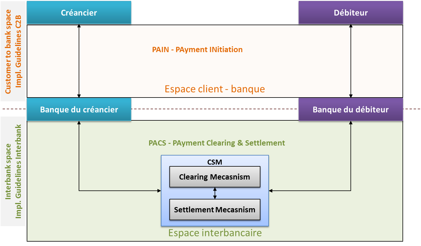 La figure ci-dessous illustre les espaces client-banque et interbancaire ainsi que les types messages que nous trouvons dans les Implementation Guidelines.